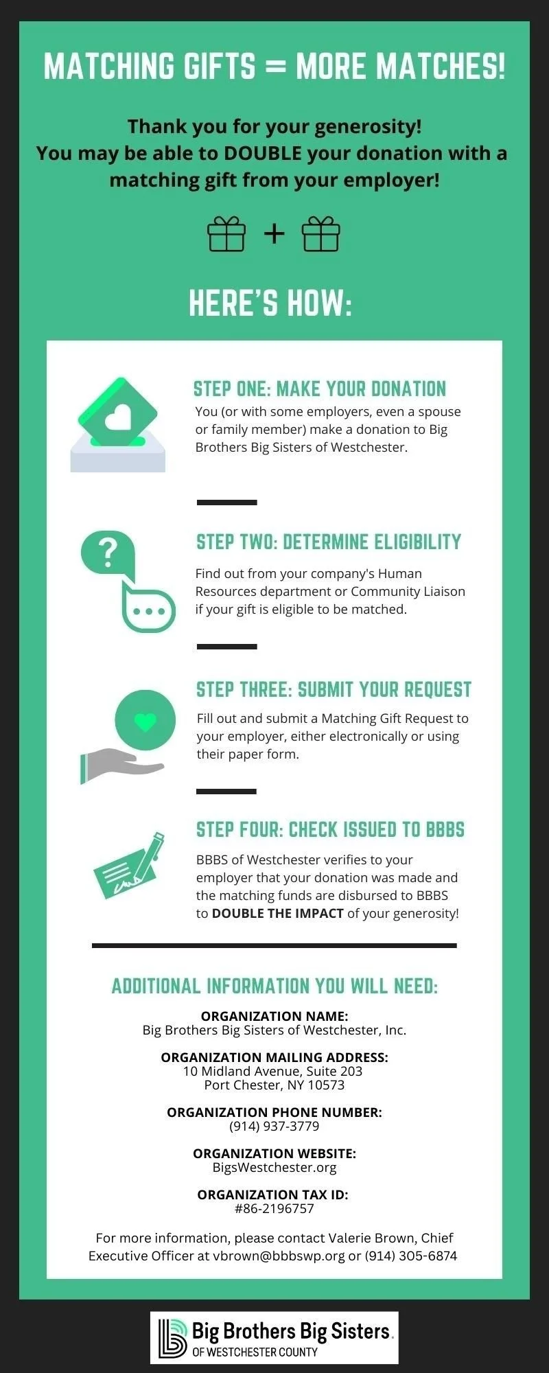 Did you know your employer may match your volunteer hours as a Big or Advisory Council member with a monetary donation to Big Brothers Big Sisters of Westchester County through a program like Dollars for Doers?