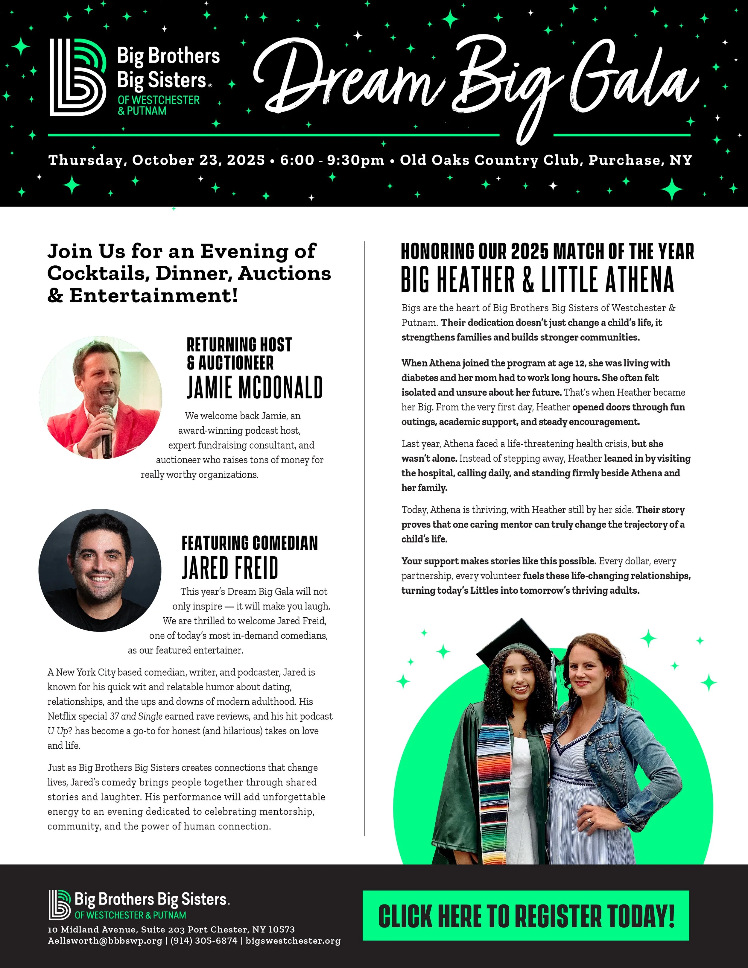 Upcoming Events:DREAM BIG GALATHURSDAY, OCTOBER 23, 2025 | OLD OAKS COUNTRY CLUB To donate or volunteer, contact Ali Valencia at avalencia@bbbswp.org or 914-937-3779